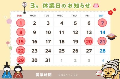 TOP お知らせ お知らせ ← 戻る 3月の店休日 お知らせ 2026/02/28 3月の店休日は、1、7、8、15、20、21、22、29 となっております。 [登録日] 2026/02/28 | 固定リンク