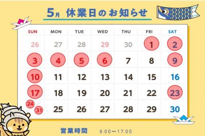TOP お知らせ お知らせ ← 戻る 5月の店休日 お知らせ 2026/04/28 5月の店休日は、1〜6、9、10、17、23、24、31となっております。 [登録日] 2026/04/28 | 固定リンク